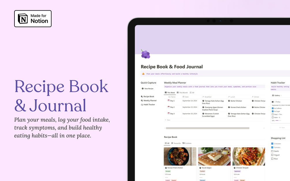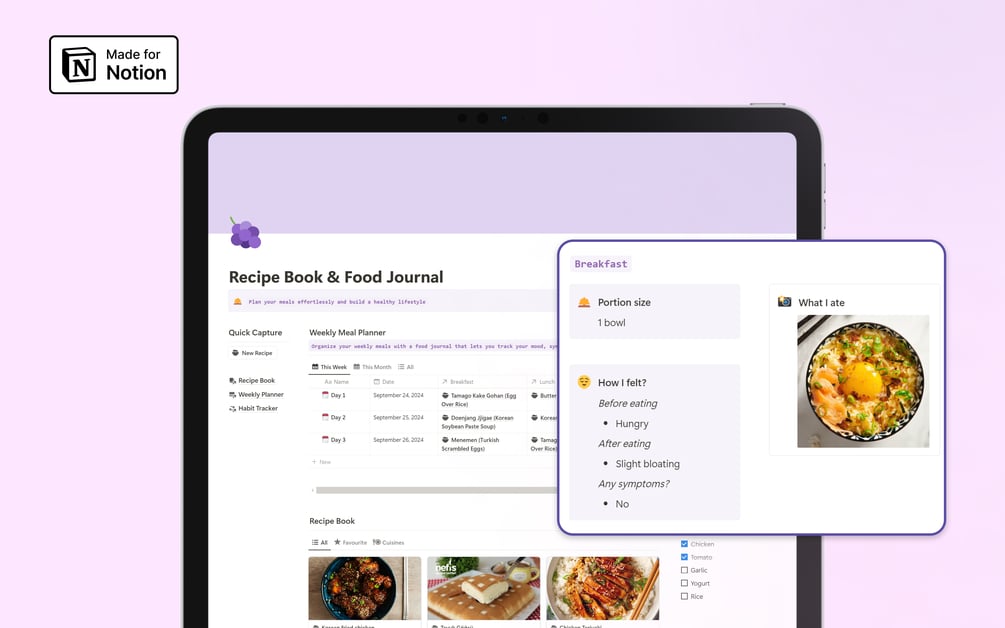 Introducing the ultimate Notion Recipe Book and Food Journal, designed to help you take control of your weekly meal planning, grocery shopping, and healthy eating habits.